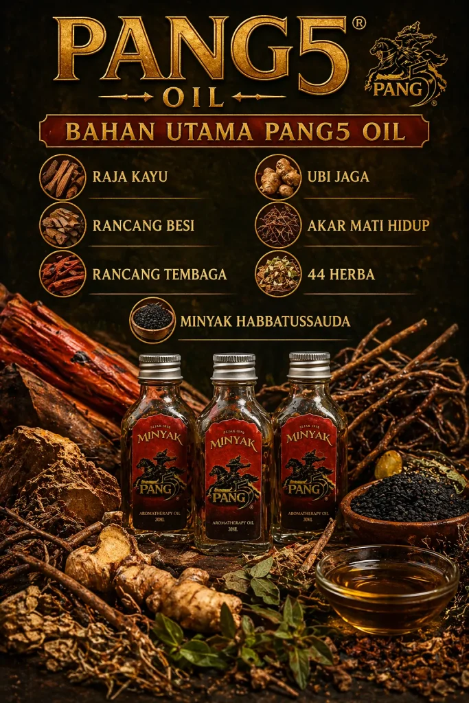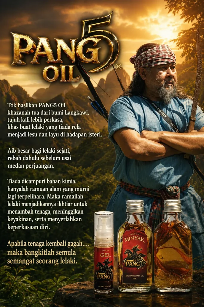 PANG5 Oil merupakan minyak herba tradisional dari bumi Langkawi yang diolah daripada petua lama turun-temurun. Dirumus dengan 48 herba terpilih menjadi minyak urut lelaki berasaskan bahan semula jadi.