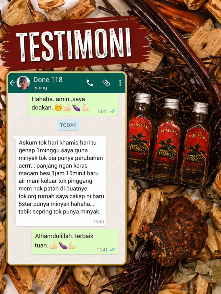 PENAFIAN: Produk ini adalah minyak untuk kegunaan luaran sahaja. Bukan ubat dan tidak bertujuan untuk mendiagnosis, merawat, menyembuhkan atau mencegah sebarang penyakit. Keberkesanan penggunaan bergantung kepada kesesuaian individu dan pengalaman setiap pengguna mungkin berbeza. Gunakan mengikut arahan yang disyorkan. Hentikan penggunaan jika berlaku ketidakselesaan atau iritasi. Elakkan terkena mata, mulut, luka terbuka dan kawasan sensitif. Simpan di tempat kering serta jauh daripada capaian kanak-kanak. Jika mempunyai masalah kesihatan atau kulit sensitif, dapatkan nasihat profesional sebelum penggunaan.